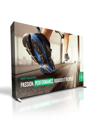 Since many years, this large format display solution is ideal for trade fairs and exhibit booths. The structure and canvas can be quickly deployed and installed by a single person in just a few minutes. This display is light and compact and can be easily stored in the carrying bag.