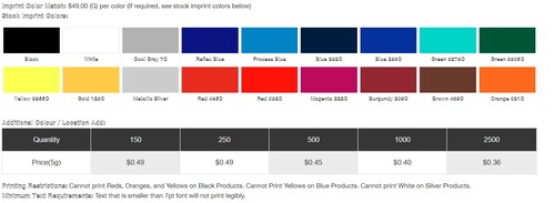 Frais de montage: 75$ par couleur imprimée par emplacement couleurs PMS standards